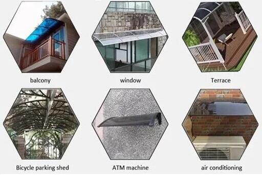 Applied on the top of Door, Window, Balcony, Gazebo, Patio, Terrace, Shop, Bicycle, Corridor, Bulletin Board, Outdoor Machine of Air Condition, ATM Teller Machine and Outdoor Mailbox, etc. for Shade, Sunshine and Raining.