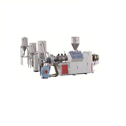 This pelletizing machine is composed by a conical twin-screw extruder and the correspondingly pelletizing downstream equipment, it is suitable for the pelletizing of PVC, PE raw material with wood power or other additives. The pellets produced by this machine is evenly, solid, elegance. The pelletizing downstream equipment is the die face cutter, air transferring unit, vibration separating and cooling unit. This pelletizing downstream equipment has the features of high automation and high production efficiency.