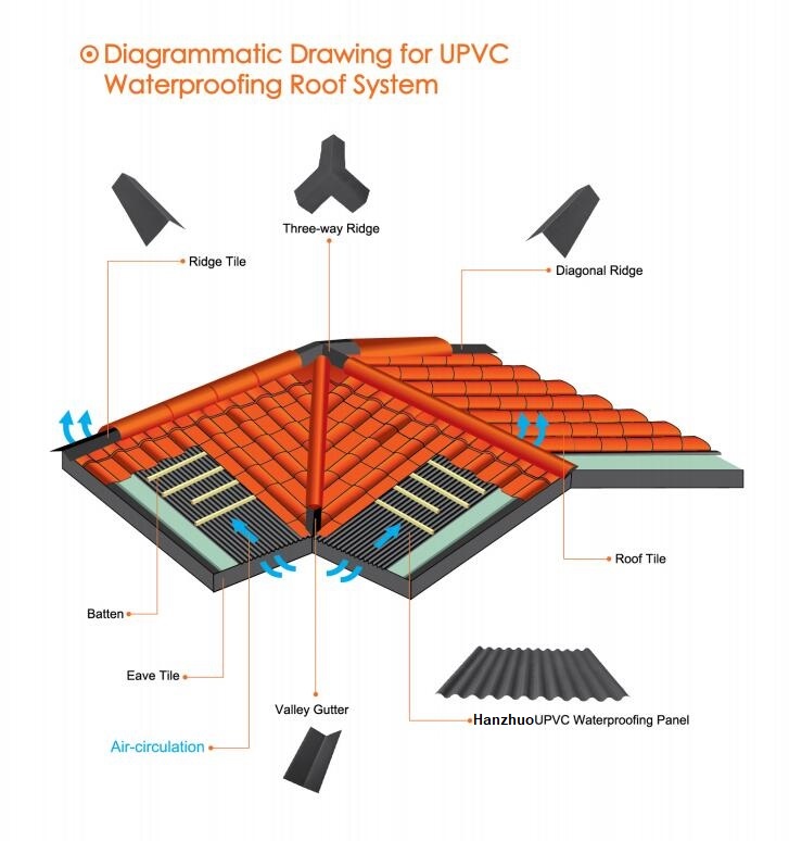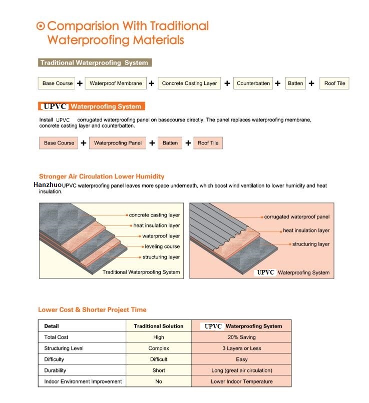 UPVC Waterproofing Panel is a new type of roofing material, providing superior air-circulation and ventilation. It substitutes waterproof layer, concrete layer and counter batten of pitched roof, so that project time limit is shortened and the total cost is lower.